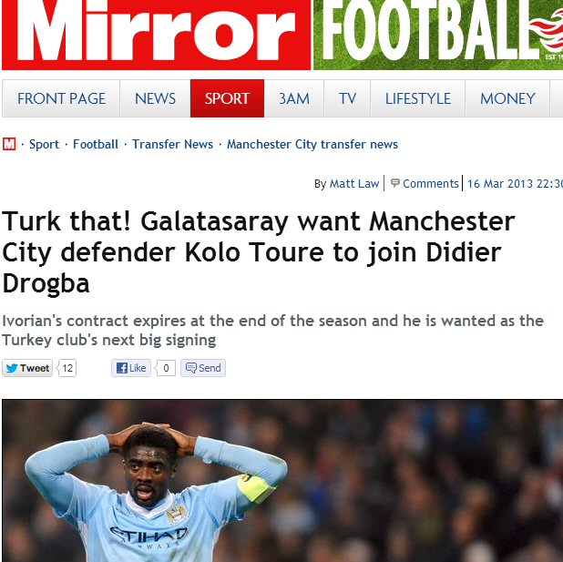 İngilizler ise Kolo Toure ile Galatasaray'ınm ismini sık sık yan yana getiriyor.  Fakat City'nin Toure'ye yeni bir kontrat önermesi hâlinde bile, Fildişili'nin Drogba tarafını seçeceği ve takımında kazandığı haftalık 120 bin pounda yakın bir ücreti rakamı sarı-kırmızılılarda da kazanacağı iddia ediliyor