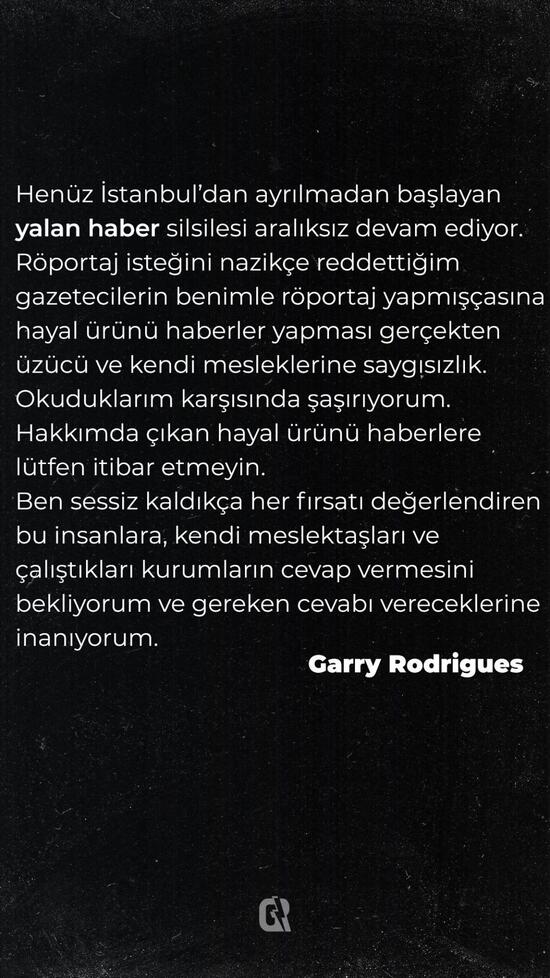 Sosyal medya hesabından açıklama yapan Garry Rodrigues "Henüz Istanbul'dan ayrılmadan başlayan yalan haber silsilesi aralıksız devam ediyor. Röportaj isteğini nazikçe reddettiğim gazetecilerin benimle röportaj yapmışçasına hayal ürünü haberler yapması gerçekten üzücü ve kendi mesleklerine saygısızlık. Okuduklarım karşısında şaşırıyorum. Hakkımda çıkan hayal ürünü haberlere lütfen itibar etmeyin. Ben sessiz kaldıkça her fırsatı değerlendiren bu insanlara, kendi meslektaşları ve çalıştıkları kurumların cevap vermesini bekliyorum ve gereken cevabı vereceklerine inanıyorum." ifadelerini kullandı.
