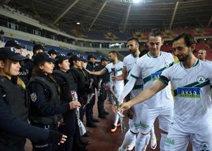Karşılaşma öncesinde Giresunspor oyuncuları, İstanbul'daki terör saldırısında şehit olan polisler anısına statta görevli polislere karanfil verirken, kaleci Eser Altın, Çevik Kuvvet Şube Müdürü Hakan Sarak'a çiçek ve Türk bayrağı hediye etti. Sarak, bayrağı öpüp alnına götürünce, oyuncu gözyaşlarını tutamadı.