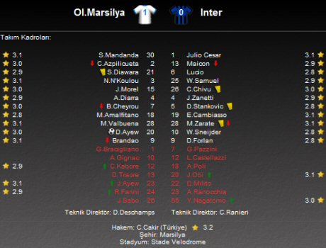 Hakemliğini Cüneyt Çakır'ın yaptığı ve 90. dakikaya kadar 0-0'lık eşitlikle devam eden mücadelede ev sahibi Marsilya oyuna hakim olan taraf olarak dikkat çekerken; dört kez Fransız ekibinin kalesine gelen Inter, dört pozisyonda da Steve Mandanda'yı mağlup etmeyi başaramadı.