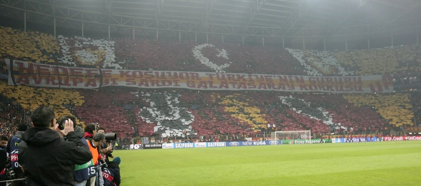 Sarı-kırmızılı taraftarlar, maç öncesi Pegasus Tribünü'nde kartonlarla bir koreografi gerçekleştirdi. Tüm tribün kartonlarla sarı-kırmızı renklere büründü. UEFA Kupası ve UEFA Süper Kupa'nın ortasında Şampiyonlar Ligi kupası figürleri yer aldı. Ayrıca, üzerinde ''Hedefe koşuyor Türkiye'nin gururu, Avrupa'yı sardı Galatasaray korkusu'' yazılı dev bir pankart açıldı.