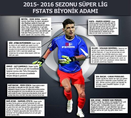 Spor Toto Süper Lig'de Beşiktaş'ın şampiyonluğuyla sona eren sezonun ardından FSTATS istatistiklerinin ışığında sezonun biyonik adamı ortaya çıktı. Biyonik adamın Beyni Beşiktaşlı Sosa olurken Kafa'sı MArio Gomez, Göz'ü ise Atiba oldu. Biyonik adamın omzu Ali Çamdalı, elleri Volkan Demirel, sol bacağı Podolski, sağ bacağı Visca, sol ayağı Van Persie ve say ayağı da Samuel Eto'o oldu.