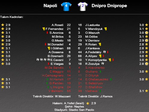 Napoli'nin gollerini 7, 77, 88 ve 90. dakikalarda Edinson Cavani atarken, Dnipro Dnipropetrovsk'un gollerini ise 33. dakikada Artem Fedetskiy, 52. dakikada Roman Zozulya attı.