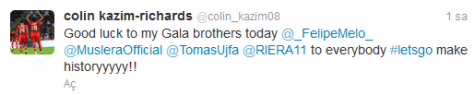 Yazdığı tweette Felipe Melo, Albert Riera, Fernando Muslera ve Tomas Ujfalusi'ye başarılar dileyen genç oyuncu; Galatasaray'ın bu maçı kazanarak tarih yazacağını belirtti.