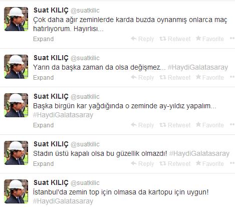 Kılıç öte yandan "İstanbul'da zemin top için olmasa da kartopu için uygun!" şeklinde bir tweet atarken "KAR rahmettir. Berekettir. "Beyaz kâbus" değildir. Kâbusun nedeni her defasında hazırlıksız yakalanan insandır." sözleriyle Galatasaray yönetimine imada bulunduğu iddia edildi.