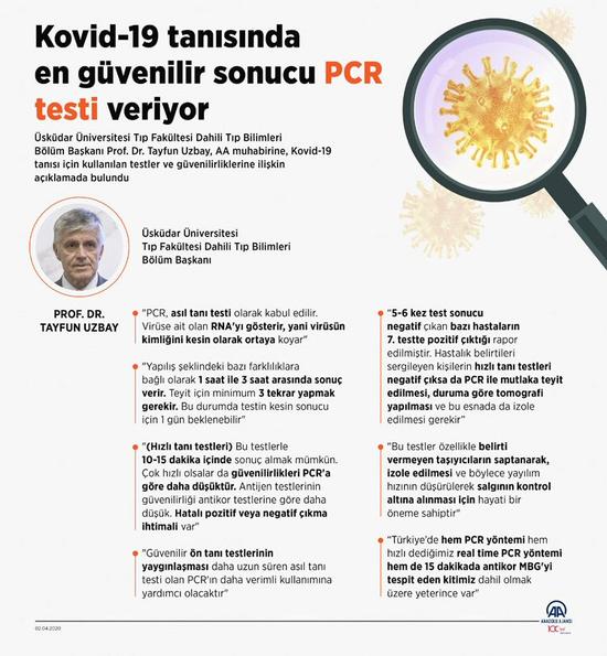 Uzbay, PCR testlerinin, yapılış şeklindeki bazı farklılıklara bağlı olarak 1 saat ile 3 saat arasında sonuç verdiğini belirterek, "Teyit için minimum 3 tekrar yapmak gerekir. Bu durumda testin kesin sonucu için 1 gün beklenebilir. Testlerin sonucunun 2-4 günde verilmesinin nedeni yığılmalardır. Test yapan merkezlerin sayısı arttıkça daha hızlı sonuç almak mümkün olacaktır." dedi.