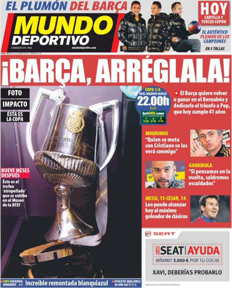 Kapağında, şu anda İspanya Futbol Federasyonu'nun müzesinde sergilenen bu kırık kupaya yer veren gazete, "Barça, düzelt bunu" başlığını atarak geçen seneki kupa yenilgisinin rövanşını alma zamanı geldiğini vurguladı.