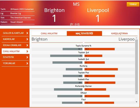 Premier Lig'de 10. hafta karşılaşmasında Graham Potter'ın takımı Brighton & Hove Albion ile Jürgen Klopp'ün çalıştırdığı Liverpool kozlarını paylaştı.