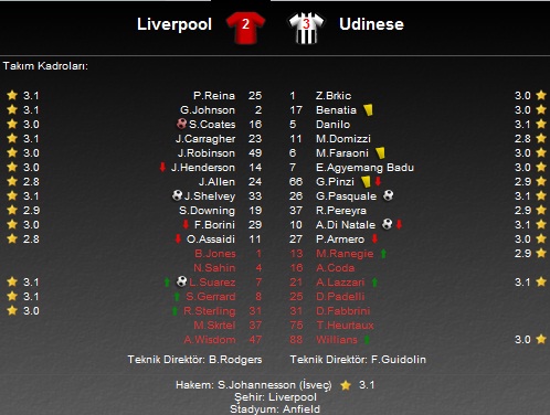UEFA Avrupa Ligi'nde göstereceği performans merakla beklenen Liverpool Udinese'ye kendi evinde 3-2'lik sonuçla teslim oldu. Ev sahibi ekip mücadelenin 23. dakikasında genç futbolcusu Jonjo Shelvey'in attığı golle 1-0 öne geçerken ikinci yarıda kendine gelen Udinese 46. dakikida Antonio Di Natale, 70. dakikada kendi kalesini havalandıran Sebastian Coates ve 72. dakikada Giovanni Pasquale'nin attığı gollerle skoru 1-3'e taşıdı. Ardı ardına gördüğü gollerle mağlup duruma düşen Liverpool, Uruguaylı yıldızı Luis Suarez'in 75. dakikada attığı golle umutlansa da karşılaşmada başka gol olmayınca Udinese 3 puanı hanesine yazdırdı.