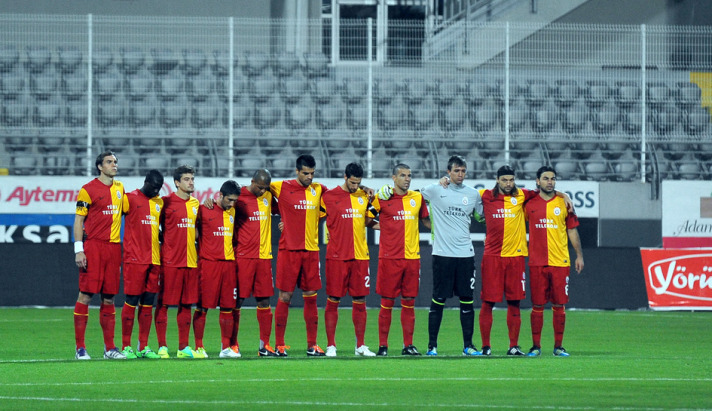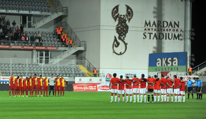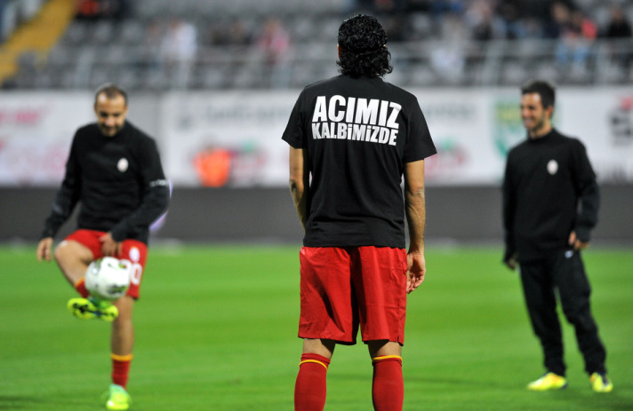 Medical Park Antalyaspor ile deplasmanda karşı karşıya gelen Galatasaray takımında futbolcular, sahaya çıkmadan önce yaptıkları ısınma hareketlerini sırt kısmında 'Acımız Kalbimizde' yazılı siyah tişörtlerle çıktı.