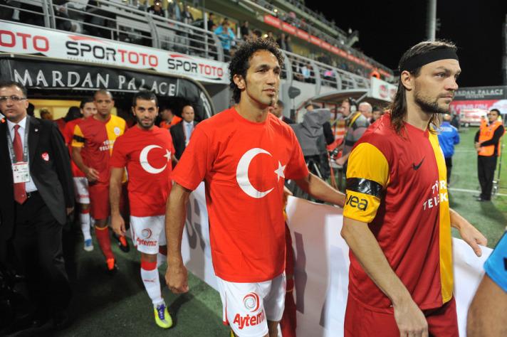 Galatasaraylı futbolcular terör olaylarını Medical Park Antalyaspor maçı öncesinde sahaya siyah tişörtlerle çıkarak lanetledi.