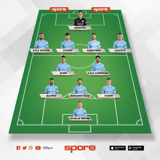 Ederson; Walker, Stones, Rúben Dias, Cancelo; Rodri, Gündoğan; Mahrez, Bernardo Silva, Foden; De Bruyne