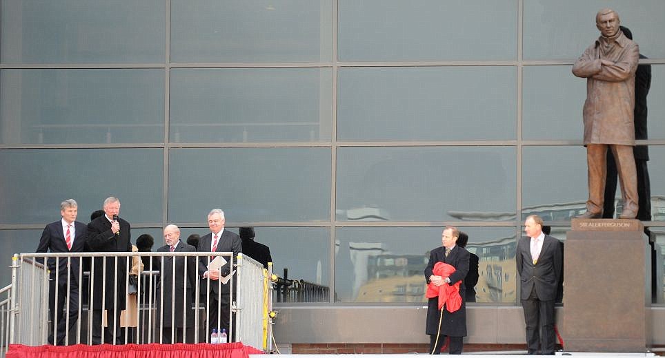 Bronzdan yapılan ve Sir Alex Ferguson'un ellerini bağladığı şekilde durduğu heykel, Manchester United'ın stadyumu Old Trafford'un önüne konuldu.