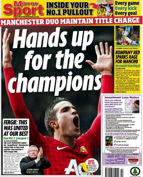 Daily Mirror tam sayfa ayırdığı maç haberinin manşetinde, Robin van Persie'nin attığı golden sonraki sevinç anının fotoğrafını kullanarak "Eller şampiyon için havaya" yorumunu yaptı.