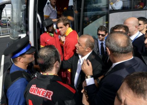 Teknik direktör Fatih Terim'in taraftarların serbest bırakılması için yaptığı girişim sonuçsuz kalırken, sarı-kırmızılı kafileyi taşıyan iki otobüs hava alanından ayrıldı.