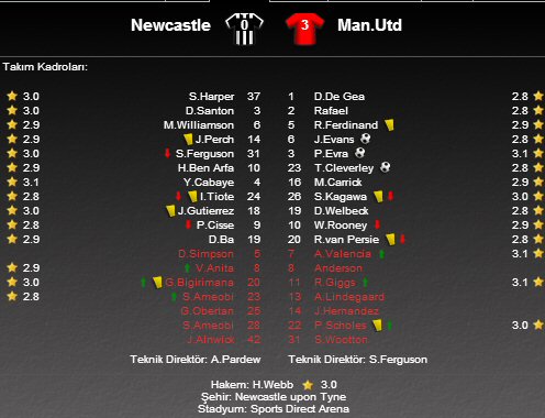 İngiltere Premier Lig 7. hafta kapanış mücadelesinde Newcastle United, evinde Manchester United'ı ağırladı. Sports Direct Arena'da oynanan karşılaşma konuk ekip Manchester United'ın 3-0'lık üstünlüğü ile sona ererken, Kırmız Şeytanlar'ın golleri 8. dakikada Jonny Evana, 16. dakikada Patrice Evra, 71. dakikada Tom Cleverley'den geldi.