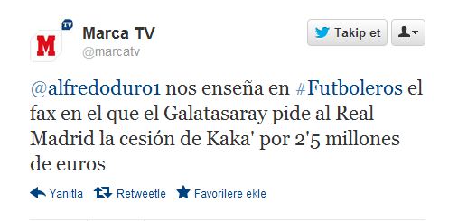 Galatasaray'ın dört gözle beklediği Kaka transferi ile ilgili dün gece geç saatlerde İspanyollar'dan sarı-kırmızılı taraftarları heyecanlandıracak bir tweet atıldı. Marca TV Official twitter hesabından atılan tweette Galatasaray'ın Kaka transferi için 2.5 milyon euroyu gözden çıkardığı öne sürüldü.