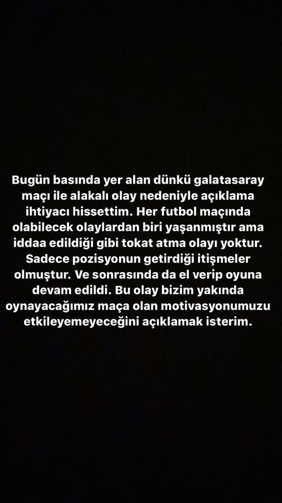 Sosyal medya hesabından açıklama yapan Halil Dervişoğlu "Bugün basında yer alan dünkü Galatasaray maçı ile alakalı olay nedeniyle açıklama ihtiyacı hissettim. Her futbol maçında olabilecek olaylardan biri yaşanmıştır ama iddia edildiği gibi tokat atma olayı yoktur. Sadece pozisyonun getirdiği itişmeler olmuştur. Ve sonrasında da el verip oyuna devam edildi. Bu olay bizim yakında oynayacağımız maça olan motivasyonumuzu etkilemeyeceğini açıklama isterim." ifadelerini kullandı.
