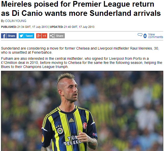 SPORX DIŞ HABERLER - İngiltere Premier Lig ekiplerinden Sunderland'in, Fenerbahçe'nin Portekizli orta sahası Raul Meireles için harekete geçtiği ileri sürüldü. Sunderland, Premier Lig tecrübesi olan orta saha için teklif yapmayı planlıyor.