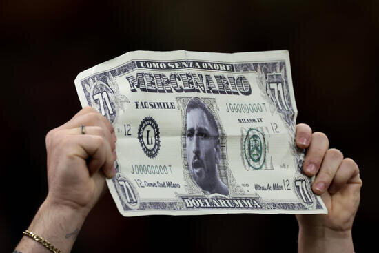 Milan ile PSG'nin karşı karşıya geldiği maçta İtalyan taraftarlar, sahaya eski oyuncuları Donnarumma'nın resminin yer aldığı sahte paraları attı.