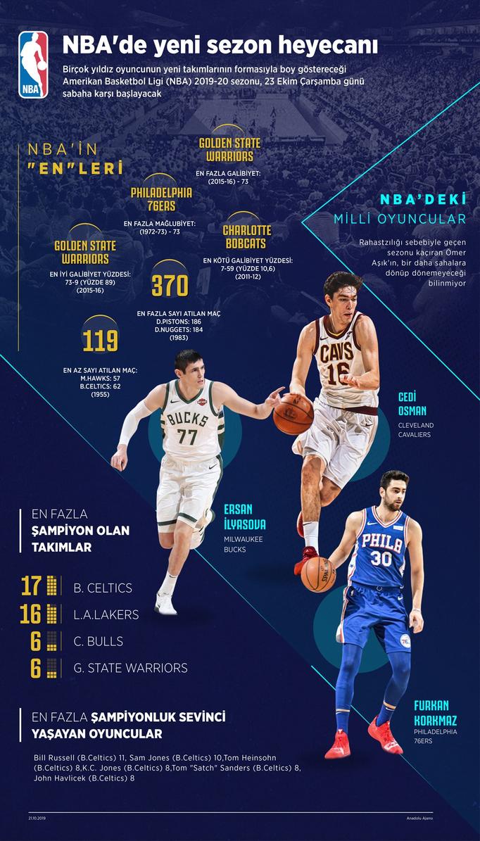 Birçok yıldız oyuncunun yeni takımlarının formasıyla boy göstereceği Amerikan Basketbol Ligi (NBA) 2019-20 sezonu, 23 Ekim Çarşamba günü sabaha karşı başlayacak.
