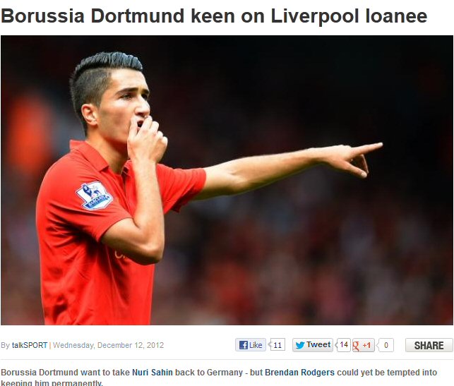 Liverpool'da alışık olduğu savunma önü oyun kurucu mevkisinde oynamayan, Uruguaylı forvet Luis Suarez'in arkasında 10 numara olarak oynayan Nuri Şahin için Dortmund'a dönmek istese de, Liverpool menajeri Brendan Rodgers Milli yıldızımızı bonservisiyle birlikte Liverpool'a transfer etmek istiyor.