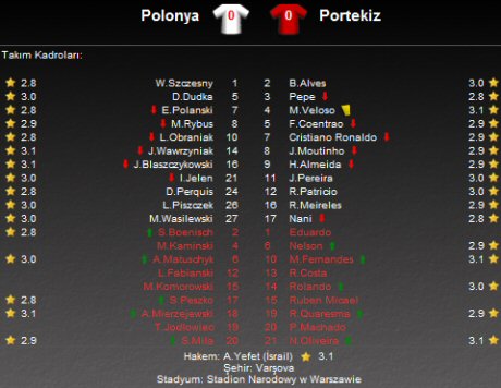 Portekiz Milli Takımı'nda Beşiktaş'ın yıldızlarından Hugo Almeida ilk 11'de forma giyip 67 dakika sahadan kalırken; Manuel Fernandes 46. dakikada Moutinho'nun; Ricardo Quaresma ise 76. dakikada Cristiano Ronaldo'nun yerine oyuna girdi. Polonya'da ise Sivassporlu Kamil Grosicki 67, Trabzonsporlu Adrian Mierzejewski ise 81. dakikada oyuna dahil oldu.