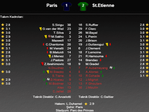 Fransa Ligi'nde sezonun ilk mağlubiyetini alan Paris Saint Germain, St.Etienne karşısında aldığı mağlubiyetle büyük sürpriz yarattı. Öte yandan Paris Saint Germain'de İsveçli yıldız Zlatan Ibrahimovic 71. dakikada gördüğü kırmızı kartla oyun dışında kaldı. Rakip kaleci Stephane Ruffier'in göğsüne tabanıyla kontrol dışı bir müdahalede bulunan Ibrahimovic direk kırmızı kartla takımını 10 kişi bıraktı.