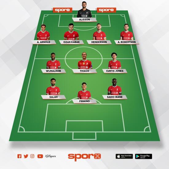 Alisson; Alexander-Arnold, Ozan Kabak, Henderson, Robertson; Thiago Alcantara, Wijnaldum, Jones; Salah, Firmino, Mane