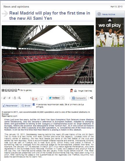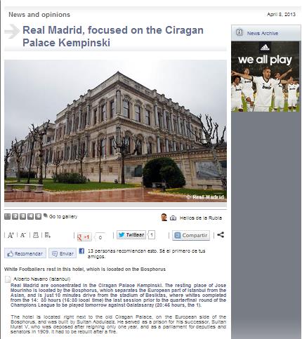 - SPORX DIŞ HABERLER - Şampiyonlar Ligi'nde çeyrek final ilk maçında Santiago Berabeu Stadı'nda temsilcimiz Galatasaray'ı 3-0 yenerek, rövanş maçı öncesinde avantajlı bir skor elde eden Real Madrid, İstanbul'da krallar gibi ağırlanıyor. İstanbul'da konaklayacak yer olarak Avrupa yakasında Boğaz kenarını tercih eden Madrid ekibinde, kulübün resmi internet sitesi ise taraftarlarını bilgilendirmek için hummalı bir çalışma içine girdi. Maçın oynanacağı Türk Telekom Arena ve konakladıkları otelin yanında bulunan Çırağan Sarayı ile ilgili bilgileri Real Madrid, gün içerisinde internet sitesinden paylaştı. İşte o paylaşımlarda öne çıkan kısımlar: