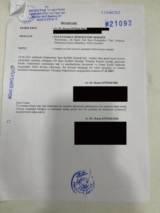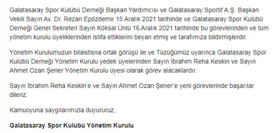 Resmi sitenin yönetim kurulu bölümünden Epözdemir ile Ünlü'nün isimleri de çıkartıldı. Hemen ardından Epözdemir, sosyal medya hesabından tepki gösterip "Galatasaray'ın yapmış olduğu duyuru ve varsa dayanağı olan yönetim kurulu kararı açıkça hukuka aykırıdır" dedi. Epözdemir, noter aracılığıyla 17 Aralık tarihli gönderide yönetim kurulundaki görevine devam ettiğini ve bu konuda herhangi bir istifa beyanının bulunmadığını belirten yazıyı da paylaştı.