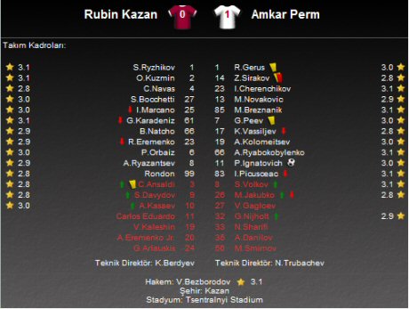 Rusya Premier Lig'de 11. hafta mücadelesinde Rubin Kazan ile Amkar Perm kozlarını paylaştı. Zentralstadion'da oynanan karşılaşma konuk ekibin 1-0'lık üstünlüğü ile sona erdi.