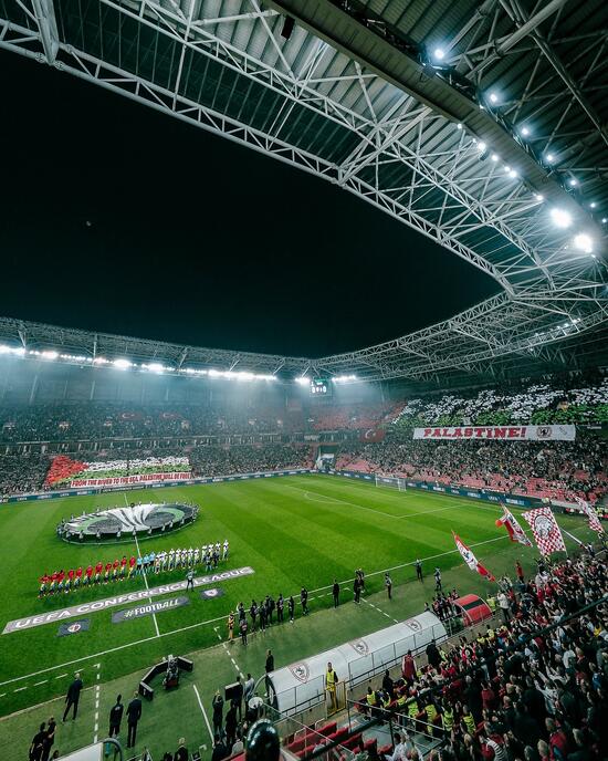 UEFA Konferans Ligi'nin üçüncü haftasında Samsunspor ile Hamrun Spartans arasında oynanan maçta kırmızı beyazlı taraftarlar, Filistin'e özel koreografi yaptı.
