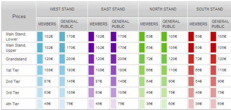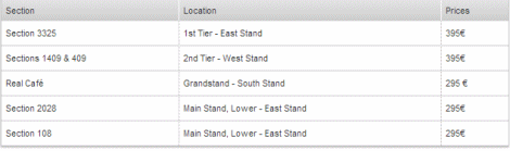Galatasaray Kulübü'nün yanı sıra Real Madrid Kulübü de resmi internet sitesi aracılığıyla bilet satışına devam ediyor. 36 euro ile 395 euro arasında de fiyatlardan satışa sunulan biletlere Real Madrid taraftarı kadar Galatasaray taraftarı da ilgi gösteriyor.
