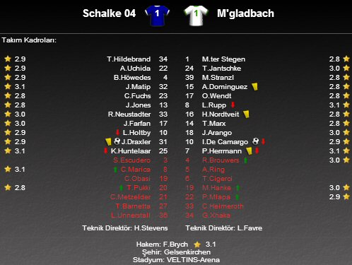 Almanya Bundesliga'nın 15. haftasında Schalke 04, Veltins Arena'da Fenerbahçe'nin UEFA Avrupa Ligi'ndeki rakiplerinden Borussia Mönchengladbach'ı konuk etti. Mücadelede her iki takımın karşılıklı golleriyle 1-1 berabere sona erdi.