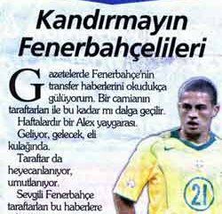 "Fenerbahçeliler bir alem. Yıllar önce bir yazı yazdım. Dedim ki, "Kandırmayın Fenerbahçelileri Alex Türkiye'ye gelmez" Bir yıl sonra geldi, yanıldım. Sanki tahminimde ilk ve tek yanılan benmişim gibi bunu yıllardır gırgır konusu yaptılar. Sürekli bunu yazıyorlar her yerde. Ben de gülüyorum, ne yapayım. Şimdi de bir kampanya başlatmışlar. Anladığım kadarıyla Sneijder isimli futbolcunun Fenerbahçe'ye gelmesini istiyorlar. Gelmesi için de tek eksik, benim; "Kandırmayın Fenerbahçelileri Sneijder Fenerbahçe'ye gelmez" diye yazmam herhalde. Fenerbahçelileri kırmak ne mümkün. Madem çok istediler yazıyorum işte; "Kandırmayın Fenerbahçelileri Sneijder Fenerbahçe'ye gelmez"