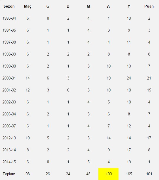 Bu sezonla birlikte 13.kez grup aşamasında yer alan Galatasaray grup ve sonraki turlarda (turnuva aşaması olarak tabir edilen) 98 maça çıktı.