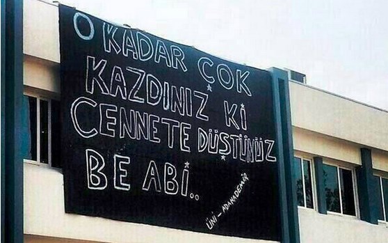 - Adana Demirsporsporlu taraftarlar, astıkları "O kadar çok kazdınız ki, Cennete düştünüz be abi" pankartı ile tepkilerini dile getirdiler.