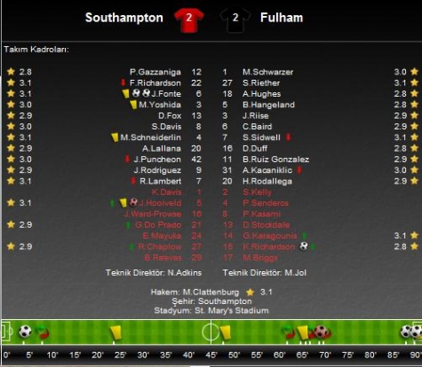 Southampton'ın gollerini 4. ve 90. dakikalarda Jose Fonte kaydetti. Fulham'ın golleri ise 69. dakikada Josh Hooiveld'in kendi kalesine ve 88. dakikada Kieran Richardson kaydetti.