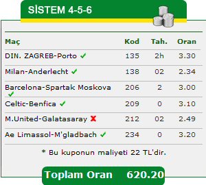 Barış Kaygusuz, hafta içi yaptığı sistem kuponunda 620.20 oran yakaladı. Dinamo Zagreb-Porto maçında Portekiz ekibine handikaplı 2 oynayan tahmincimiz, Milan-Anderlecht maçında ise sürpriz bir 02 çifte şans tahminini bildi. 6 maçta tek yanıldığı tahmin ise M.United-G.Saray karşılaşmasındaki 02 çifte şanstı.