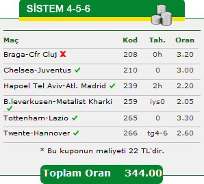 Fatih Şamlıoğlu da sistem kuponunda şov yapan bir diğer isimdi. 344.00 gibi ciddi bir oran yakalayan tahmincimiz, sadece Braga - Cluj maçında yanıldı. Chelsea-Juventus ve Tottenham Lazio beraberliklerini bilen Fatih Şamlıoğlu, Twente - Hannover mücadelesinde 4-6 gol olur tahminini bildi.