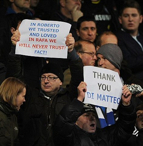Chelsea'nin başında Stamford Bridge'de ilk maçına çıkacak Benitez'i büyük bir şok bekliyordu. Benitez'i Stamford Bridge'de görmek istemedikleri yönünde tezahüratlar yapan ve bu yöndeki tepkilerini pankartlar ile ifade eden Chelsea taraftarları, Di Metteo'ya ise sahip çıkarak şükranlarını sundu.