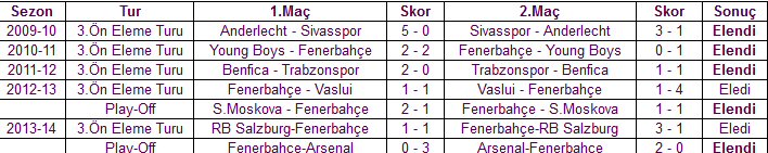 2013-14 ve 2012-13 sezonlarında Fenerbahçe, 3.Ön Eleme turunda Vaslui takımını 1-1 ve 4-1 ile elerken play-off turunda Spartak Moskova takımına 1-2 ve 1-1 ile elendi.