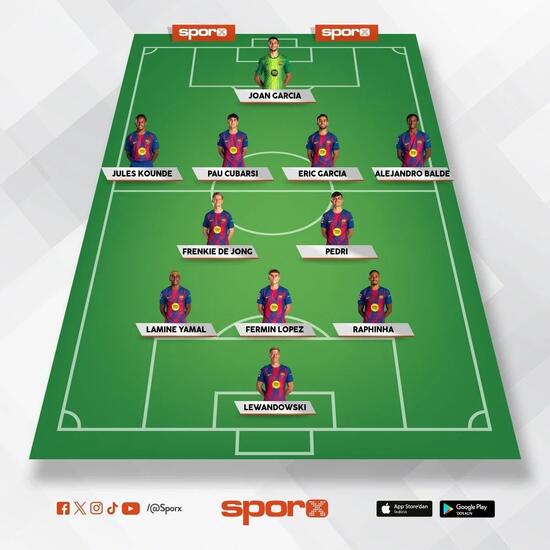 Barcelona: Joan Garcia, Kounde, Cubarsi, Eric Garcia, Balde, De Jong, Pedri, Yamal, Fermin Lopez, Raphinha, Lewandowski.