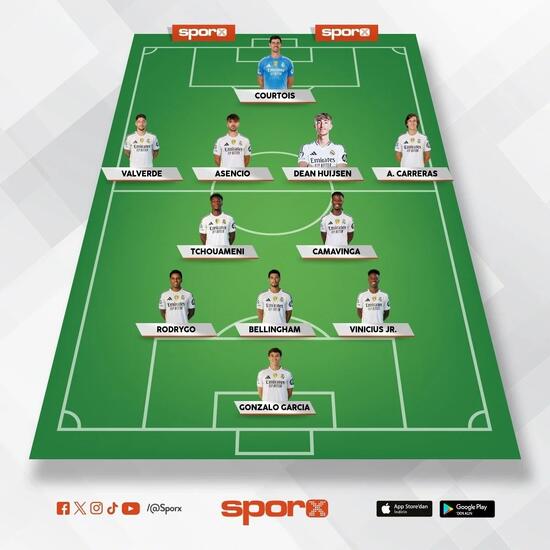 Real Madrid: Courtois, Valverde, Asencio, Huijsen, Carreras, Tchouameni, Camavinga, Rodrygo, Bellingham, Vinicius, Gonzalo Garcia.