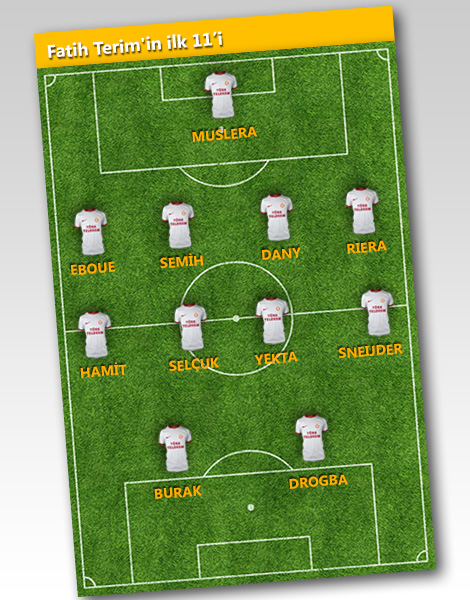 Akhisar karşısında sonradan oyuna giren ve maçın kaderini değiştiren Didier Drogba'yı ilk 11'de görevlendirmeyi planlayan Terim, Fildişili yıldızın yanı sıra Wesley Sneijder'e de ilk 11'de görev verecek. Galatasaray taraftarının buluşma noktası olan Webaslan.com'da yapılan 'Sizce Terim'in 11'i nasıl olmalı" anketinde sarı-kırmızılı taraftarlar büyük oranda Felipe Melo'nun ilk 11'de olması gerektiği yönünde görüş bildirdi.