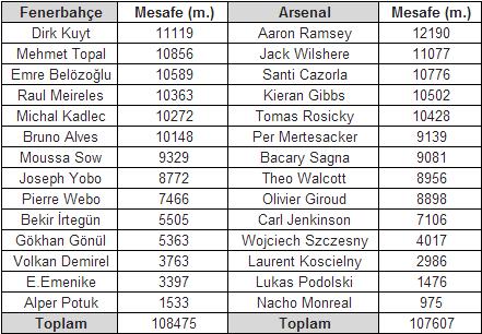 Fenerbahçe maç boyunca Arsenal takımına oranla daha fazla mesafe katetti. Fenerbahçe 108.5 km mesafe katederken Arsenal 107.6 mesafe katetti. Sahanın en çok mesafe kateden ismi Aaron Ramsey (12.2 km) olurken Fenerbahçe takımında en çok Dirk Kuyt (11.1 km) katetti.