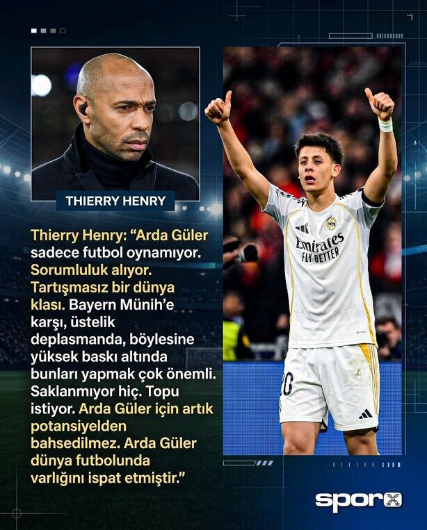 Dünya futbolunun efsane isimlerinden Thierry Henry, Real Madrid'in Bayern Münih ile oynadığı maça iki gol ve performansıyla damga vuran milli futbolcumuz Arda Güler'den övgü dolu sözlerle bahsetti.