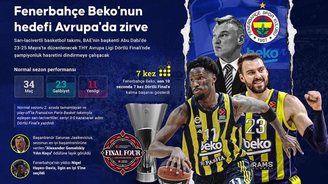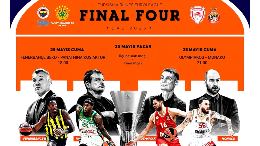 THY EuroLeague Final Four, Abu Dabi'deki Etihad Arena'da 23-25 Mayıs'ta düzenlenecek. Fenerbahçe Beko, Panathinaikos ile 18.00'de karşılaşacak. Diğer yarı final maçında ise Olympiakos ile Monaco 21.00'de karşı karşıya gelecek. Maçlar S Sport'tan yayınlanacak. Öncesi, sırası ve sonrasında tüm gelişmeler Sporx'te olacak.