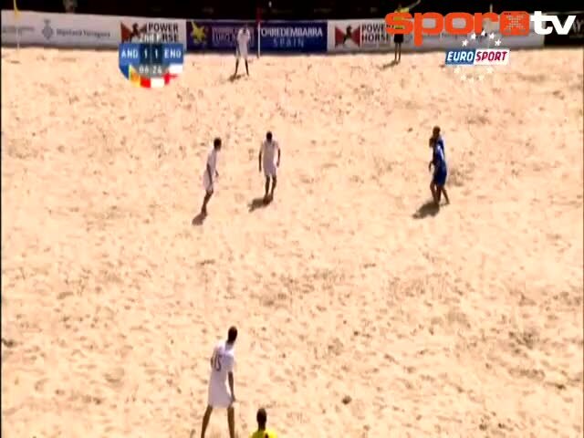 İngiltere ile Andora arasında oynanan plaj futbolu maçında İngiltere milli takımının kalecisi Sam Webb uzak mesafeden attığı gol ile izleyenlere kendi...